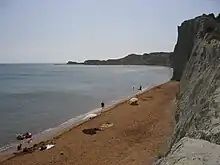 The beach is a 4 kilometres (2.5 mi) strip of sand which is up to 50 metres (160 ft) wide in places. Several roads branch on the approach to the area and bring one out at different locations along its length, usually close to a bar, taverna or apartment complex.