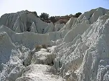 The surrounding sediment and cliffs at Xi Beach are made up of a white clay, which is eroded into sharp profiles by the rain. The beach is made up of a soft, red sand.