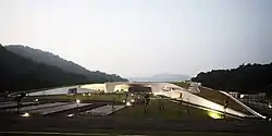 The center was designed by architect Dan Norihiko with a theme of promoting the harmonious integration between human habitation and the natural world.[1][2] The structure consists of two curved wings with central canopies, the latter each measuring 34 m (112 ft) in length and 8 m (26 ft) in height.[3][4]