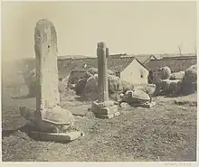 Xiao Xiu's tomb is located in the Ganjia Lane (Chinese: 甘家巷; pinyin: Gānjiā xiàng) neighborhood in today's Qixia District north-east of Nanjing (32°08′38″N 118°55′02″E / 32.14389°N 118.91722°E). It is thought that the sculptural ensemble of the tomb included a pair of winged lion-like animals (bixie), four steles supported by stone tortoises, and a pair of fluted columns.[4] Visited and photographed by Victor Segalen in 1917, the ensemble of the Tomb of Xiao Xiu (with his name better known under its French transcription, Siao Sieou)[5] soon became well known to Europe's and the world's students of ancient Chinese sculpture. Presently, the site is on the grounds of Gan Jia Xiang Elementary School.[3]