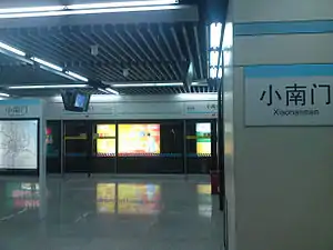 Xiaonanmen (simplified Chinese: 小南门; traditional Chinese: 小南門; pinyin: Xiǎonánmén; lit. 'little south gate') is a station on Line 9 of the Shanghai Metro. As part of the line's phase 2 easterly extension, it began operation on December 31, 2009.[1] It is the first station in Puxi when travelling southwest-bound on Line 9 from Pudong.