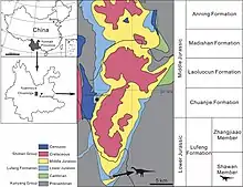 The Lufeng Formation contains mudstones and siltstones from lakes, rivers, and overbank deposits.[20] Many sauropodomorphs asides from Xingxiulong are known from the Lufeng Formation, including Lufengosaurus huenei, L. magnus, Yunnanosaurus huangi, "Gyposaurus" sinensis, Jingshanosaurus xinwaensis, Chuxiongosaurus lufengensis,[1] Xixiposaurus suni, "Yizhousaurus sunae",[21] and Pachysuchus imperfectus. Also present are the theropods Sinosaurus triassicus, Lukousaurus yini,[20] Shidaisaurus jinae,[21][22] and Eshanosaurus deguchiianus;[23] the ornithischians Tatisaurus oehleri[20] and Bienosaurus lufengensis; the crocodylomorphs Dibothrosuchus elaphros, Platyognathus hsui, Microchampsa scutata, and Dianosuchus changchiawaensis, and Dianchungosaurus lufengensis; the indeterminate archosaur Strigosuchus licinus; the sphenodontians Clevosaurus petilus, C. wangi, and C. mcgilli; the tritylodontid cynodonts Bienotherium yunnanense, B. minor, B. magnum, Lufengia deltcata, Yunnanodon brevirostre, and Dianzhongia longirostrata; the mammals Sinoconodon rigneyi, Morganucodon oehleri, M. heikoupengensis, and Kunminia minima; proganochelyid turtles; and a "labyrinthodont" amphibian.[20]