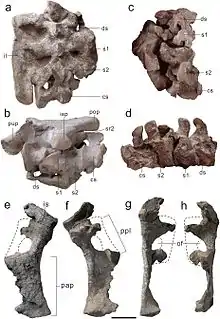 Unusually among basal sauropodomorphs, Xingxiulong has four sacral vertebrae. This is a trait typically seen in more derived sauropodomorphs, like Melanorosaurus, Leonerasaurus,[11] Barapasaurus,[12] and Shunosaurus. The first of these sacral vertebrae, the dorsosacral, is not very well-fused to the next sacral vertebra; neither is it entirely fused to the corresponding sacral rib on the transverse processes. Collectively, the dorsosacral and first pair of sacral ribs extend forward to contact the ilium. The second and third sacral vertebrae, the two primordial sacrals, are about the same length, and are well-fused to each other. Like other basal sauropodomorphs, the transverse processes of the third sacral vertebra project backwards and outwards. The same is true of the transverse process and sacral ribs for the fourth sacral vertebra, which contact the ilium again at the back. All of the neural spines are plate-like, like the last few dorsal vertebrae.[1]