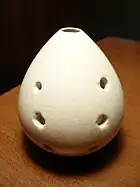 - large, shaped like a goose egg, with flattened bottom and six holes (lower pitch);