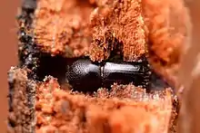 Xylosandrus germanus are tiny insects, where females measure up to approximately two millimeters.[5] These insects are known for boring into trees, especially those that are under distress. Trees provide protection for the beetle which ensures the progression of their life cycle. Throughout the winter months, beetles accumulate in tree trunk galleries for protection.[5][6] Once the winter months pass, adults leave their galleries in search of new hosts.[6] The beetle's search is guided by the presence of ethanol, which is synthesized in larger quantities by dead or distressed woody material.[6][7] Field research conducted in Slovakia suggests that cold winter temperatures have little impact on the persistence of X. germanus.[6]