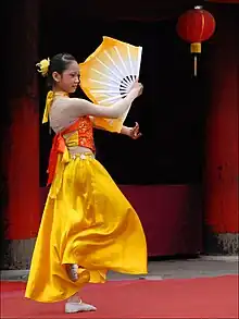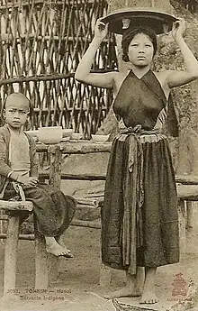 Chinese clothing in the form of trousers and tunic were mandated by the Nguyễn dynasty. As late as the 1920s, in Vietnam's north area in isolated hamlets skirts were still worn.[15] Ming, Tang, and Han dynasty-styled clothing was ordered to be adopted by Vietnamese military and bureaucrats by the Nguyễn lord Nguyễn Phúc Khoát.[16] Pants were mandated by the Nguyễn in 1744 and the cheongsam inspired the áo dài.[17] Chinese clothing started influencing Vietnamese dress during the Lý dynasty. The predecessor of the current áo dài (Áo ngũ thân) was introduced by the Nguyễn lords.[18]