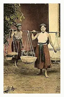 The yếm might have originated from the Chinese dudou, a variant of similar undergarments used in China since antiquity whose use spread under the Ming and Qing dynasties. During the late 19th until the 20th century, it was mainly worn by women in northern Vietnam. Unlike other Vietnamese clothing that helped to segregate the classes, the unseen yếm were worn as an undergarment by Vietnamese women of all walks of life, from peasant women toiling in the fields to imperial consorts. It is an integral part of the áo tứ thân costume, which it is often worn underneath.