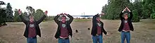 The YMCA dance demonstrated in a photomontage. In this rendition, the M (second from left) is done in a popular variant.