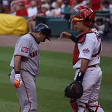 Before the All-Star break, Molina batted just .223. However, he was voted to start his second consecutive game, and second overall, and played four innings.[63] After the All-Star break, his hitting improved, as he stroked 63 hits in 200 at bats for .315 batting average. During a game against the Cincinnati Reds on August 10, as second baseman Brandon Phillips came to bat, he exchanged words with Molina that escalated to a bench-clearing confrontation, although no one was ejected.[64] On September 17, he amassed a career-high five RBIs and career-tying four hits against San Diego, including two doubles.[63] After an examination on his sore right knee on September 23, Molina was shut down for the rest of the season, missing 12 games.[65][66]