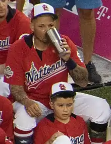 On July 7, he was selected to his seventh consecutive All-Star Game, played at Great American Ball Park in Cincinnati.[142] In the Reds' clubhouse for the All-Star Game, Molina shared a locker with Reds' second baseman Brandon Phillips. Since the brawl between the Cardinals and Reds in 2010, the two mended their schism, and Molina has a photograph of their families together.[143] When informed whose locker he was using, Molina replied, "This is Phillips' locker? How about that? I'll have to write something to him."[144] While the pregame roster introductions were made, Reds fans booed all six Cardinals players who were selected, and even former Cardinal Albert Pujols. When Molina was introduced, he smiled and turned and pointed his thumbs toward the back of his jersey. Pujols provided levity when he then joined in the booing. After the game, Molina remarked to reporters, "when you spend 12 years coming to Cincinnati and you beat them so many times, they’re going to boo you." In his career to that point, he hit .319 with a .352 on-base percentage and .500 slugging percentage in 270 career at-bats at Great American Ball Park.[145]