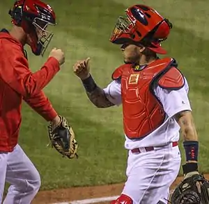 The Cardinals squared off against the Pirates in the NLDS. Two weeks removed from just missing a no-hitter, Wacha again nearly repeated the feat with Molina behind the plate in an elimination game, Game 4. Molina threw out pinch runner Josh Harrison attempting to steal second base in the eighth inning to help the Cardinals preserve a 2–1 lead.[117] In the World Series against the Boston Red Sox, Molina became just the ninth player – and the first in the expansion era – in franchise history to appear in four World Series with the club, and the first since Stan Musial in the 1946 World Series, also against the Red Sox.[118] Molina collected more awards following the season, including his first Silver Slugger Award,[119] sixth Gold Glove, and a third-place finish in MVP voting.[120] Molina was a co-winner, along with Wainwright and Matt Carpenter, for the BBWAA St. Louis Baseball Man of the Year.[39]