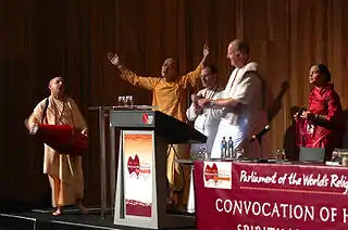 Yadunandana Swami, a disciple of Satsvarupa dasa Goswami, is originally from Spain. Among other subjects, he teaches Bhaktivaibhava courses at Bhaktivedanta College and is specializing on History of sannyasa in ISKCON.[3][4][5][6] On 10 March 2009 Yadunandana received sannyasa within the presence of current ISKCON sannyasa minister Prahladananda Swami, ceremony was introduced by his godbrother Hridaya Caitanya Dasa, Kadamba Kanana Swami performed the fire sacrifice and Jayadvaita Swami officially awarded danda staff. He has been described as one "of the best scholars in the field of ISKCON Studies"[7] and has represented ISKCON, along with other senior swami of ISKCON, Indradyumna Swami, in the parliament (Maha Satsang) of World Religions.[8] He was the first ISKCON speaker on Krishna Consciousness and the Environment in 2009 Parliament of World's Religions and 2011 World Yoga Masters Summit for Proclamation of the World Yoga Day.[9][10]