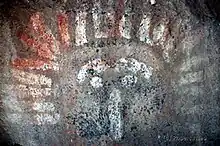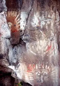 The rock paintings are stylized polychromatic paintings using white, red and black colors. The paintings are said to have been enhanced by Lucullus Virgil McWhorter using enamel paints, a technique unacceptable to today's preservation community.