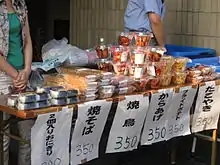 Yakitori is not limited to speciality shops: It is readily found on the menus of izakaya all across Japan and is sold pre-cooked, as frozen vacuum packs, or even canned. The latter was made popular by Hotei Foods Corporation, the first company that started selling yakitori-in-can in 1970,[4] with nine flavors as of 2016. Their TV commercial song has been iconic to their brand name.[5]