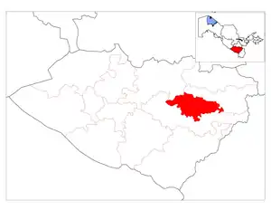 Yakkabogʻ District is a district of Qashqadaryo Region in Uzbekistan. The capital lies at the city Yakkabogʻ.[1] It has an area of 1,100 km2 (420 sq mi)[2] and its population is 266,100 (2021 est.).[3] The district consists of one city (Yakkabogʻ), 14 urban-type settlements (Eski Yakkabogʻ, Alaqargʻa, Alakoʻylak, Jarqirgʻiz, Qayragʻoch, Qatagʻon, Kattabogʻ, Madaniyat, Mevazor, Samoq, Turon, Oʻz, Chubron, Edilbek) and 9 rural communities.[1]