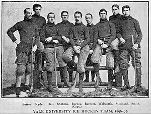 In the early years of the program, the team played under the direction of captains in a player-coach role and team managers.[8] Despite not having an official head coach, the team proved successful in the early years of the program playing various amateur athletic clubs and a growing number of intercollegiate teams at various schools in the Northeast.[6] Yale won its first intercollegiate championship in the fourth season of the program in 1899 when the Bulldogs went 6–0 through the season. Yale continued its early success winning the intercollegiate championship in each of the next three seasons.[6] On February 22, 1904, the Bulldogs played their 100th game at the St. Nicholas Rink in New York, a 2–5 loss against rival Harvard.[6] The team won its 100th game on January 8, 1913, with a 6–0 shutout at Columbia.[6]