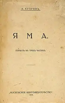 The Pit (Russian: Яма, romanized: Yama, published in English as Yama: The Pit) is a novel by Alexander Kuprin published in installments between 1909 and 1915, in Zemlya almanacs (Part 1 in 1909 and Parts 2–3 in 1914–1915). The book, centering on a brothel, owned by a woman named Anna Markovna, caused much controversy in its time.[1][2]