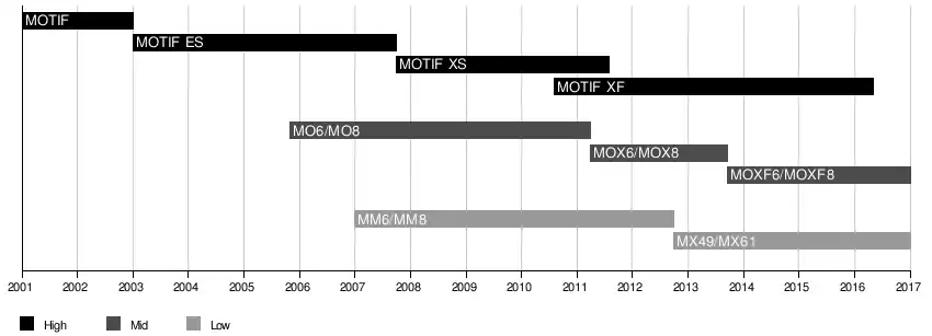 | MOTIF 6 | 2001 | 61 | FS (semi-weighted) | 62 | 84MB | 1,309 | 384 presets + 48 kits, 128 user, 128 performances, 128 master |
