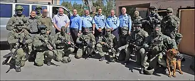 ![]() Yamam officers in full gear during raid training, armed with M4A1 rifles and operating police dog (K9) | |