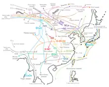 Proposed population migration routes into Japan, based on haplogroups.[21][22][23][24][25][26][27][28]