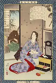 Yamauchi Chiyo (山内千代) or Kenshōin (見性院, 1557 – 1617) was a Japanese noble lady from the Sengoku period to the early of the Edo period. Known in history for her dedication and devotion to her family, she was vitally important to the success of the Yamauchi clan, a samurai clan under the leadership of her husband, Yamauchi Kazutoyo. It is said that she was responsible for stabilizing the predominance of the Yamauchi clan, and the formation of the Tosa domain.[1]
