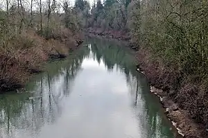The Yamhill River is an 11-mile (18 km) tributary of the Willamette River, in the U.S. state of Oregon. Formed by the confluence of the South Yamhill River and the North Yamhill River about 3 miles (5 km) east of McMinnville, it drains part of the Northern Oregon Coast Range. The river meanders east past Dayton to join the Willamette River at its river mile (RM) 55 or river kilometer (RK) 89, south of Newberg.[4][6]
