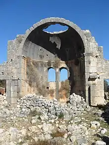 Yanıkhan was a village. There are more than 30 house ruins. The most important building is a basilica. Although the houses are completely demolished a part of the basilica survives. In addition to main abscissa there are two minor abscissas. There are two sarcophagi. One may be an arcosolium which may belong to a certain Georgios Konon Chrisyophoros who, according to an inscription, was the commissioner of the basilica. There is also a cistern to the west of the basilica.[3] 100 metres (330 ft) to the east of the basilica there is another church (called Church B by the archaeologists).