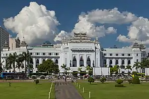 Yangon City Hall (Burmese: ရန်ကုန်မြို့တော်ခန်းမ; YCH) is the city hall of Yangon, the largest city of Myanmar, and the seat of the city's administrative body, Yangon City Development Committee (YCDC). The building is considered a fine example of syncretic Burmese architecture, featuring traditional tiered roofs called pyatthat, and was designed by Burmese architect U Tin, who also designed Central Railway Station.[1] Construction began in 1926 and ended in 1936.[2] The city hall occupies the former site of the Ripon Hall.[2]