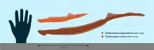 The species Y. occisor has a body length of 64 centimetres (25 in), which would make it the largest extinct fossil lamprey discovered. Both members of this genus resemble the modern pouched lamprey (Geotria australis). Yanliaomyzon bears a toothed oral disc that is much more similar to those of modern lampreys than those of Paleozoic lampreys. The two species are distinguished by differences in the anatomy of the toothed oral disc, as well as that the tail occupies around 40% of the body length in Yanliaomyzon ingensdentes but less than 28% of the total body length in Y. occisor.[1]