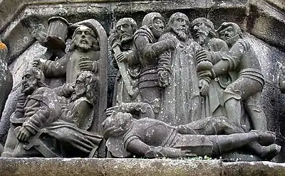 In the text below there are several references to an "enclos paroissial" and this French term can be translated as parish close. These are not uncommon in Finistère and were built in the 16th and 17th centuries. The enclosure comprises an elaborately decorated parish church surrounded by an entirely walled churchyard with gateway, often an arched gateway. In England cathedral closes for example, include many residential and administrative buildings, as well as the church, but Breton Parish closes contained only buildings and structures designed for worship: the church itself, a calvary, and sometimes an ossuary or charnel house with chapel and a cemetery. The calvaries of such church enclosures are significant works of popular art and more often than not they display Christ and the two thieves whilst at the base many feature relief panels, free-standing sculptural groups or both. These groups depict onlookers of the crucifixion and nearly always include the Virgin Mary and John the Evangelist, but also many other heroes and villains – sometimes including local or national magnates. The ossuaries in such enclosures are often of large proportions and some were intended to contain large sculptures or paintings, frequently of the Deposition or Entombment of Christ. In most cases the bones have been moved from the ossuary to the cemetery although a few still hold skeletal remains. [1]
