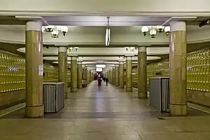 Yasenevo (Russian: Ясенево) is a station on the Kaluzhsko-Rizhskaya Line of the Moscow Metro. It was designed by N. Shumakov, G. Mun, and N. Shurygina and opened on 17 January 1990. Yasenevo has round, greenish marble columns and walls faced with yellowish metallic tile and pink marble. The recessed oblong spaces between ceiling beams house chandeliers of a simple geometric design.