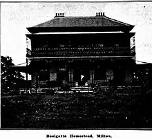 Boolgatta is one of the finest homesteads in the Shoalhaven. The Victorian Georgian Mansion was constructed by James Poole for pioneer James Warden. Warden designed the house to rival the prestige of Airlie House owned by his brother and bitter rival, David Warden. It is located on the Princes Highway.[32]
