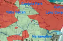 Parts of Yatte Yattah were impacted by the large Currowan fire during the 2019-20 Black Summer fire season. A number of businesses, properties and homes were destroyed on New Year's Eve including the Eagleview Farm Piggery and the Yatte Yattah Nursery.[35] Two bodies were located inside burned out vehicles near the Princes Highway the following day.[36][37] The Currowan fire predominantly impacted the elevated topography of Yatte Yattah with the low-lying alluvial flats mostly unaffected. The cleared grazing land at Boolgatta Flat acted as a protective buffer.[38]
