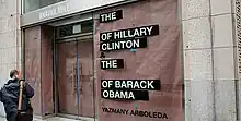 Arboleda claimed that the word "assassination" wasn't meant literally, and that "the exhibition is supposed to be about character assassination. It’s philosophical and metaphorical."[33] He reported that the Secret Service told him that the exhibition "could incite someone to do something crazy, like break the window. It’s terrible, because they’re violating my rights. If someone breaks a window, they’re committing a crime."[34]