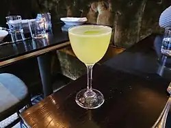 The origins of the yellow bird name is unclear.[2] Some sources mention that the cocktail was named after the Haitian tune "Yellow Bird",[2][3] that was first rewritten in English in 1957[2] that became a sort of national anthem of the Caribbean due to the popularity of Harry Belafonte's recording.[3] Hawaiian singer Arthur Lyman, one of the influencers of the tiki culture's exotica music, released a version of the song which rose to number four in July 1961 on the Billboard charts and was played weekly at Shell Bar in The Hawaii Village, a possible birthplace of the cocktail.[2]