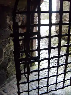 A yett (from the Old English and Scots language word for "gate")[2] is a gate or grille of latticed wrought iron bars used for defensive purposes in castles and tower houses.[3] Unlike a portcullis, which is raised and lowered vertically using mechanical means, yetts are hinged in the manner of a traditional gate or door,[4] and secured by bolts attached to the yett, or by long bars drawn out from the wall or gateway.[5]
