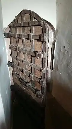 The yett was frequently used as a cheaper alternative to the portcullis,[12] since it was simpler in concept, less cumbersome and more practical.[7] However, it was also used within more complex defensive arrangements. The 14th-century castle at Doune, in Perthshire, had a portcullis in the main gateway supplemented by a yett, with a second yett at the far bailey end of the passage. The yetts each had two leaves, with a wicket gate inserted within one of the leaves.[13] Commonly, the yett would be placed behind a wooden door, providing additional security should the outer door be burned.[14]