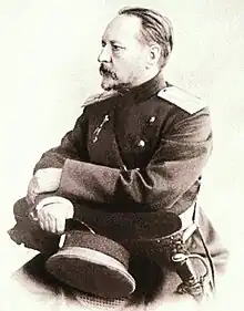 In 1880, Maximov served with a Flying Medical Company offering medical aid to wounded men during the Russian conquest of Turkmenistan.[6] During this time, Maximov met Mikhail Skobelev, the famous "White General" who led the conquest of Central Asia, who always remained Maximov's role model.[7] Despite his ostensible medical duties, in practice Maximov led an "advance flying squad" of cavalry that fought against the Turkmen as Skobelev led his army deeper and deeper into Central Asia.[5] In 1881 after the assassination of the Emperor Alexander II by Narodnik terrorists, the monarchist Maximov joined the Corps of Gendarmes in order to fight against anarchists as like many other Russian conservatives, Maximov was outraged over the assassination of Alexander II.[8] Maximov served in the Caucasus as a gendarme until his resignation in 1884.[8]