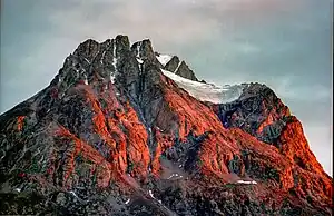 The conspicuous Devil's Castle (Teufelsschloss) is located on the other side of Kaiser Franz Joseph Fjord, off the southern shore of Cape Petersens, the NW extremity of Ymer Island.[5]