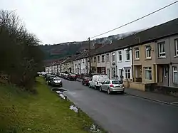 Ynysddu was founded in the early 19th century by the enlightened local colliery owner John Hodder Moggridge, who lived at nearby Woodfield Park.[3] It got its name from Ynsyddu Farm, which was built by Moggridge in 1804. Ynysddu comes from the Welsh descriptive words 'Ynys' ('island' or 'river meadow') and 'ddu' ('black').[4][5] 'Black river meadow' is appropriate for the landscape of the area.