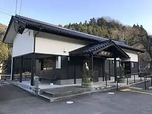 The station consists of two side platforms serving two tracks on a side hill cutting. The station building is a modern structure but built in traditional Japanese style with a tiled roof, tiled entrance portico and verandah at the side. It is unstaffed and serves only as a waiting room. A flight of steps leads up the side hill cutting to the station building from the access road (National Route 386). Access to the island platform is by means of a footbridge.[2][3][4]