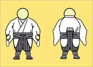 The outfit worn by the yobidashi is loosely based on an old style Japanese workman's outfit, with tatsuke-bakama (裁着袴), working trousers, and tabi socks.[20] The kimono worn by the yobidashi often displays sponsors' names in black characters and logo.[11] As there are currently eight main sponsors of the Sumo Association,[21] each yobidashi has eight different kimono which he wears during all 15 days of each basho.[10] The costume is the same for senior and junior ranked yobidashi and only the kimono worn on the torso varies in color and the names on the back. Since the kimono diplay the logos and names of the sponsors, it is often offered by them and the yobidashi rarely choose the colors of their kimono. Their hakama colours and designs, on the other hand, are often decided within an ichimon, but it can also be presented by rikishi who have been promoted to ōzeki or yokozuna as a commemorative gift and the shikona, or ring name, of the said wrestler can be seen at top of the back of the hakama, in place of the name of the stable to which the yobidashi belongs, which is normally found there.[10][18]