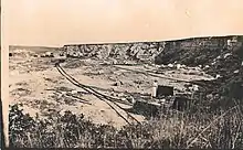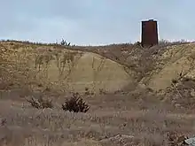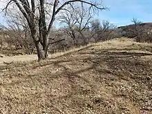 An abandoned railroad alignment is south of the present county highway, with the original highway alignment lying 300 yards (270 m) to the north in the old townsite. The original alignment of the railroad was cut across the slump blocks that had slid from the slope into the creek, which was undercutting the bluff. Slumping is characteristic on bluffs of the Fort Hays Escarpment, where the deep Carlile Shale weathers away but is unable to support high, steep slopes.[74][75] As in the Benecke photograph of the treeless Hog Back, this slump formed a narrow terrain between the deep banks of Big Creek and the steep slope of the bluff. The blocks of the slump obstructed wagon traffic west from Fort Hays, which found routes over the Hog Back further south.[76][7] The railroad, however, was able to cut a roadbed through the slumping. Unfortunately, the slump was not stable and the railroad repeatedly repaired the shifting roadbed over the decades. By the early 1900s, railroad surveyors considered tunneling through the Hogback.[77] Eventually, the railroad drove many pilings into the bank (still visible from the highway), but failed to stabilize the roadbed. In 1951–52,[78][79] Union Pacific straightened the alignment of the tracks to cut across the bow of Big Creek though the abandoned townsite, also cutting a new channel for the creek about 500 feet (150 m) to the north.[80] The portion of original creek channel at the base of the bluff remains, water still occasionally ponding where Benecke's sportsmen fished in 1873.[81][82][83]
