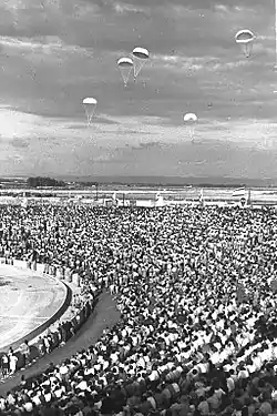 Kashi applied to take a skydiving course, but was rejected on the grounds of gender. The head of the IDF Women's Corps at the time, Col. Susana Werner, claimed that being a paratrooper was a profession restricted to men, and declined to give her approval.[4] The physicians at the Paratroopers Brigade claimed that skydiving could cause damage to the female body, which could prevent in the future the possibility of carrying a successful pregnancy.[2] Kashi insisted and finally managed, with the help of examples of paratroopers from other countries, to convince Yehuda Harari, the founder and commander of the parachuting school, to accept her. Menucha Fidel from moshav Hogla, also volunteered to join the course and the two women passed it successfully, becoming the first women to take a parachuting course in the IDF and completed it after five jumps.[2] Kashi and Fidel participated in the parachute parade at Ramat Gan Stadium, at the graduation ceremony of the 1950 Maccabiah Games.