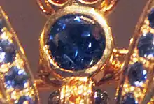 Several Yogo sapphires are kept at the Smithsonian Institution. The earliest donations were noted in the museum's annual report on June 30, 1899, when the institution reported that Dr. L. T. Chamberlain gave them two cut Yogo sapphires and 21 other sapphires for their Dr. Isaac Lea gem and mineral collection.[91] The record-setting 10.2-carat (2.04 g) cut Yogo is also held by the Smithsonian.[11][27][28] In 2006, gemologist Robert Kane of Fine Gems International in Helena, donated 333 Montana sapphires, weighing a total of 27.07 carats (5.414 g), to the Smithsonian's Gem and Mineral Collection, along with 98.48 grams of 18K yellow gold for the creation of a piece of jewelry.[92][93] A representative of the Smithsonian asked Paula Crevoshay, a jewelry designer from Albuquerque, New Mexico, to create a piece of finished jewelry from these gems.[94][93] Crevoshay felt that a butterfly motif would best represent America's natural beauty, honor her mother's love of butterflies, and display the wide range of colors found in Montana sapphires. Crevoshay named the brooch "Conchita" in honor of her mother; it is also referred to as the "Sapphire Butterfly Brooch", "Conchita Sapphire Butterfly", and the "Montana Butterfly Brooch". Two of the sapphires used are cabochon cut and the rest are brilliant cut.[94] The majority are from the Rock Creek deposit. The largest one, however, is a blue Yogo used for the butterfly's head. Other sapphires used included yellow, purple, pink, and orange gems. Crevoshay completed the brooch in 2007; she and Kane presented the finished brooch to Smithsonian curator Jeffrey Post on May 7, 2007, in Washington, DC.[94][95]