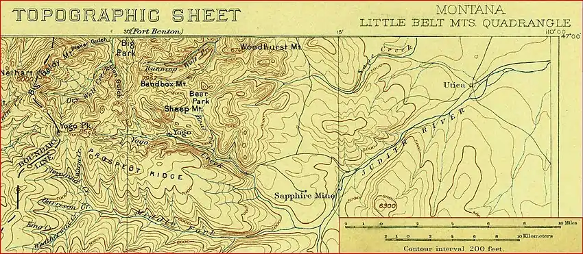 Yogo Gulch and the corresponding natural features of Yogo Peak (8,625 feet (2,629 m)), Yogo Creek, and the Yogo dike, where the gems are mined, are all in the Little Belt Mountains within Judith Basin County.[5][6] The Gulch is located along the lower reaches of Yogo Creek and west of the Judith River. The west end of the Yogo dike outcrops just southwest of Yogo Creek, about 3 miles (5 km) north of Yogo Creek's confluence with the Middle Fork of the Judith River; from there it runs east-northeast and ends about 0.5 miles (800 m) from the Judith River.[9] Yogo Creek starts just south of Yogo Peak, which is about 15 miles (24 km) west of the Judith River. From there the creek flows southeast into the Middle Fork of the Judith River.[9] The Judith River then flows northeast from the Little Belts toward Utica. East of the Judith River is Pig-Eye Basin, where Jake Hoover, credited as the person who discovered Yogo sapphires, owned a ranch.[10]