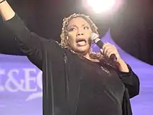 King attended and spoke at the Human Rights Campaign Detroit Gala Dinner of 2000. In a twenty-four-minute-long speech, she brought up the presidential election of that year, and also quoted the words of Bobby Kennedy by recalling his line which he took from George Bernard Shaw, that of "Some men see things as they are and say why? I dream things that never were and say why not?".[93] During a presentation in May 2000, King was asked if the human race would ever become "color blind". In response, she pushed for "the goal" to be "color acceptance."[94] Following the September 11 attacks, King spoke in North Chicago in 2002 and related that her father's wisdom during the crisis would have been of great aid to her. She mentioned the possibility that the event could have been a calling for Americans to put their loyalty towards "their race, tribe and nation", as her father once said.[95] She, her brother Martin Luther King III and Al Sharpton sang We Shall Overcome in front of "The Sphere", which stood atop the World Trade Center prior to the September 11 attacks.[96]