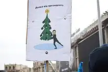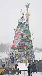 During the Euromaidan Protests in 2013–2014, the protesters prevented the Christmas tree from being completed in the Independence Square in Kyiv, and has since been satired as being the "Yolka". This tree has also been a symbol of the Revolution of Dignity,[4] and was not taken down until August 2014.[5]