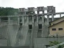 The Yomasari Dam is a hollow-core concrete gravity dam with several central spillways.