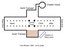 At one point, over 120 firefighters were at the site dealing with the blaze, along with 20 pumps and three turntable ladders, from stations across the neighbouring brigade of North Yorkshire as far apart as Scarborough, Harrogate and Selby.[17][18] The firefighters were fighting the blaze for over four hours and had to lay hose lines to the River Ouse for a sufficient water supply.[19][20] With the roof of the south transept well alight, the fire service had to consider what to do to protect the rest of the minster; the prevailing wind was blowing the fire towards the rest of the cathedral.[21] A decision was made to pull the remaining roof structure down to make a fire break and stop the fire spreading to the tower.[22] The fire brigade used jets of water to pull the roof down, this was logged as being achieved at 4:00 am.[23] The firefighters who were trying to extinguish the fire from the roof space reported an odd sensation of the floor moving underneath their feet as the roof timbers slipped down to the ground, often helped by the molten lead which had been used as a roof covering.[24] The fire was declared under control by 5:54 am, however, firefighters remained on site damping down[note 3] for a period of 24 hours.[10][26]